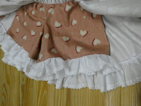 | パンツの裾にも綿レースつけました。 動き回るとちらちら見えるパンツの裾レースもプリティです(#^.^#) |
