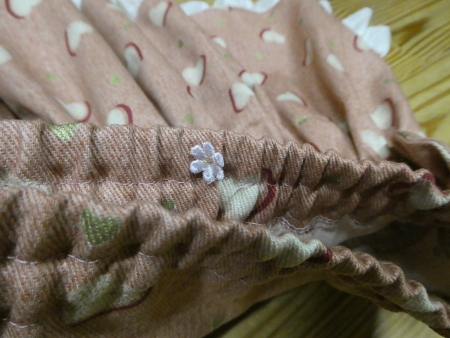 | 前後がわかりやすいように、ウエストゴムの内側、前中心に小花をつけておきました。 | |